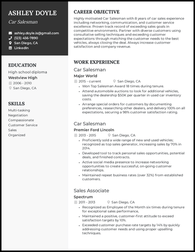 Pro advice and expert tips ensure the ideal Auto Sales Consultant resume creation. Download Car Salesman Resume PDF Why this resume works As a car salesman you want to prominently display your sales numbers including net profits revenue generated. Learn what should be included.